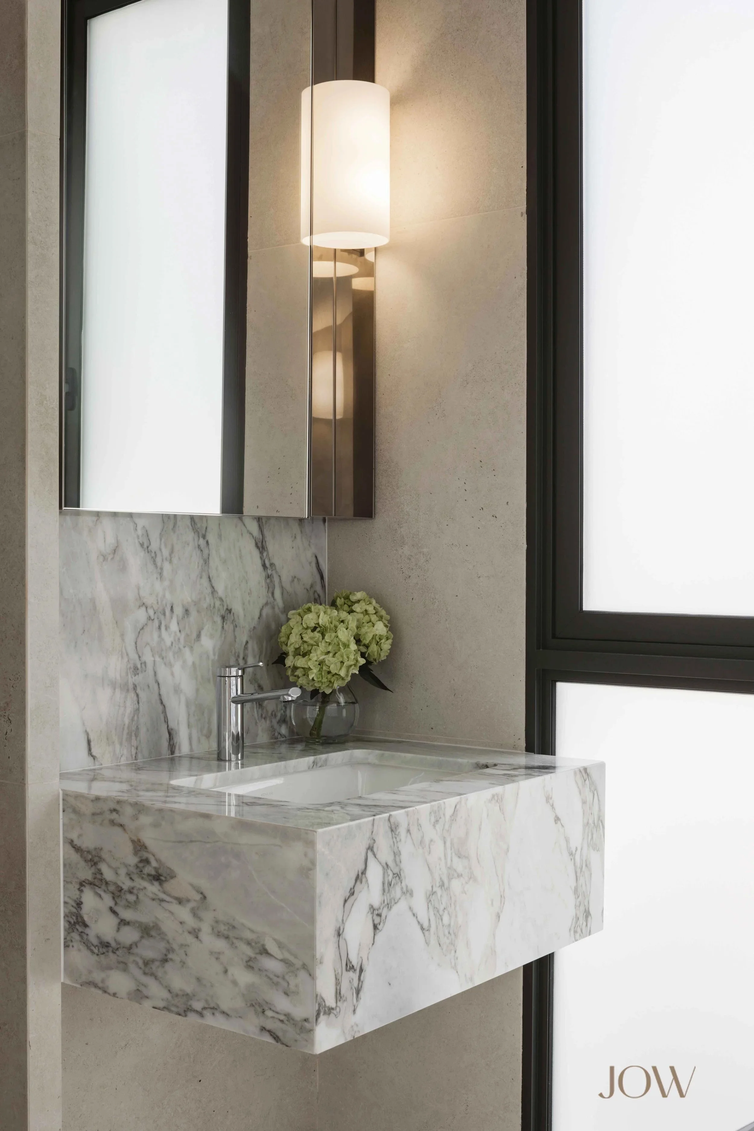 On the second storey, spatial reconfiguration establishes a more intentional hierarchy. The master suite is conceived as an enfilade — bedroom, grooming room and bathroom arranged in succession, culminating in a freestanding bathtub. This linear progression creates layered vistas and a gradual transition toward privacy. The relocated study benefits from the pitched ceiling and floor-to-ceiling glazing, while a fixed glass partition allows daylight to permeate into the adjoining family space. At the attic level, new glazing along the stairwell borrows light from the skylight to brighten the entertainment room.