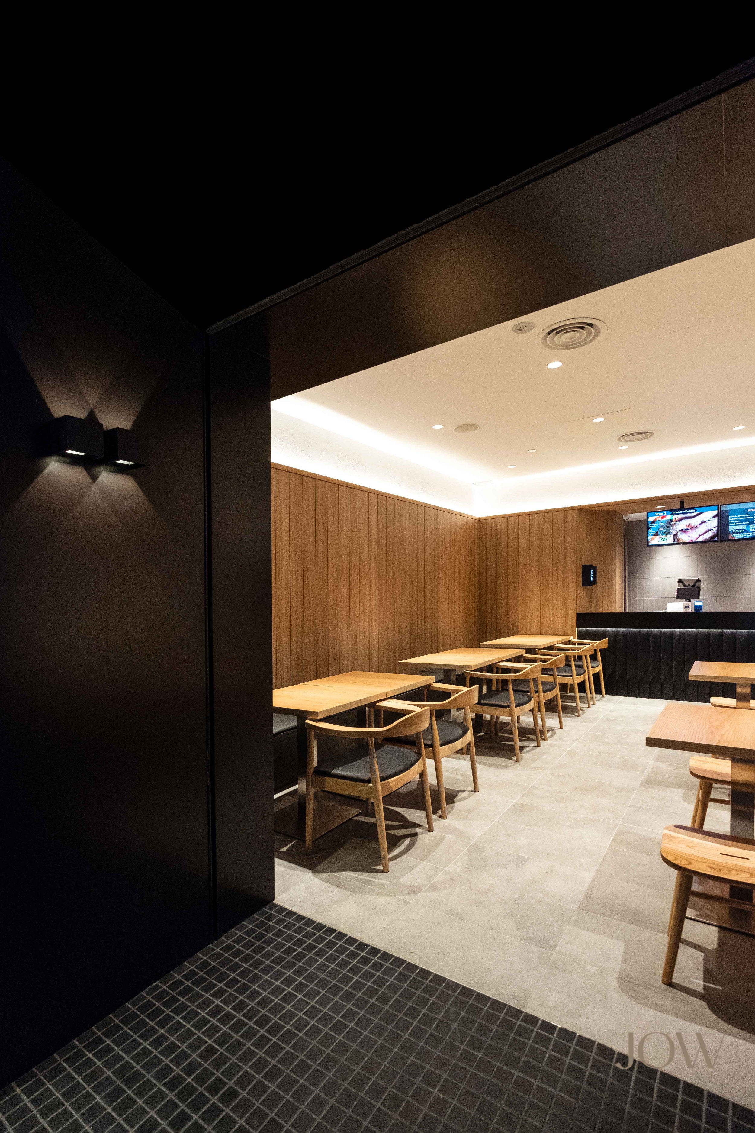 The restaurant is made up of a series of spaces experienced in sequential order; from the dark compressed space at the entrance portal, to the expansion of space at the front of the restaurant, accentuated by uplighting along oak timber paneled walls, and then culminating to a communal table set beneath a sculptural feature element. The visual elements are executed in a restrained manner to create a calm composed space infused with subtle contemporary Japanese aesthetics.