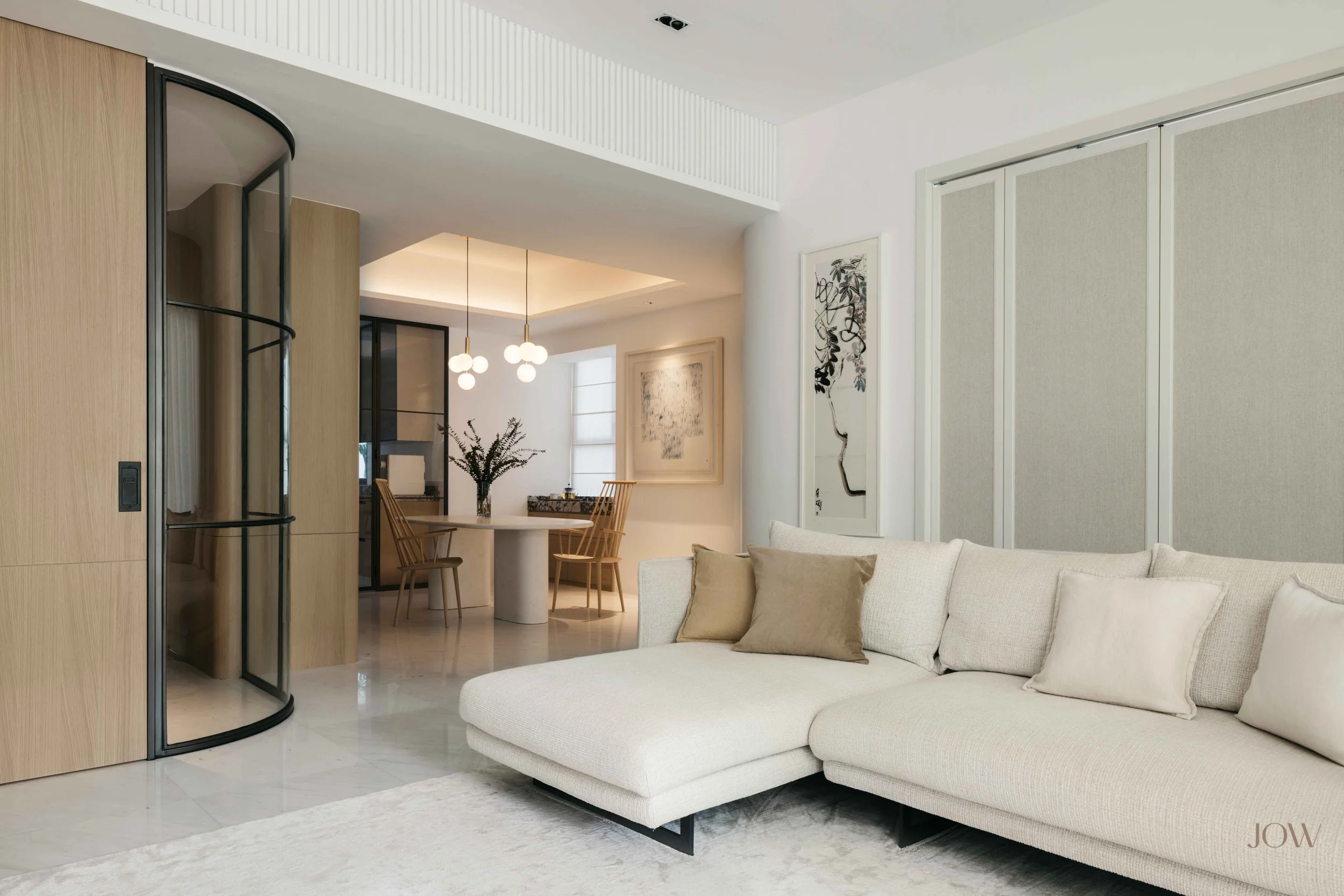 Nestled on the ground level of a condominium complex, the homeowners have direct access to the great outdoors and its verdant surroundings. The owners desire to extend their living space beyond the confines of their home and establish a visual connection with the outdoors. This was achieved by the introduction to a series of curved walls at the entrance foyer as well as soft drapes across the sliding doors leading out to the patio.